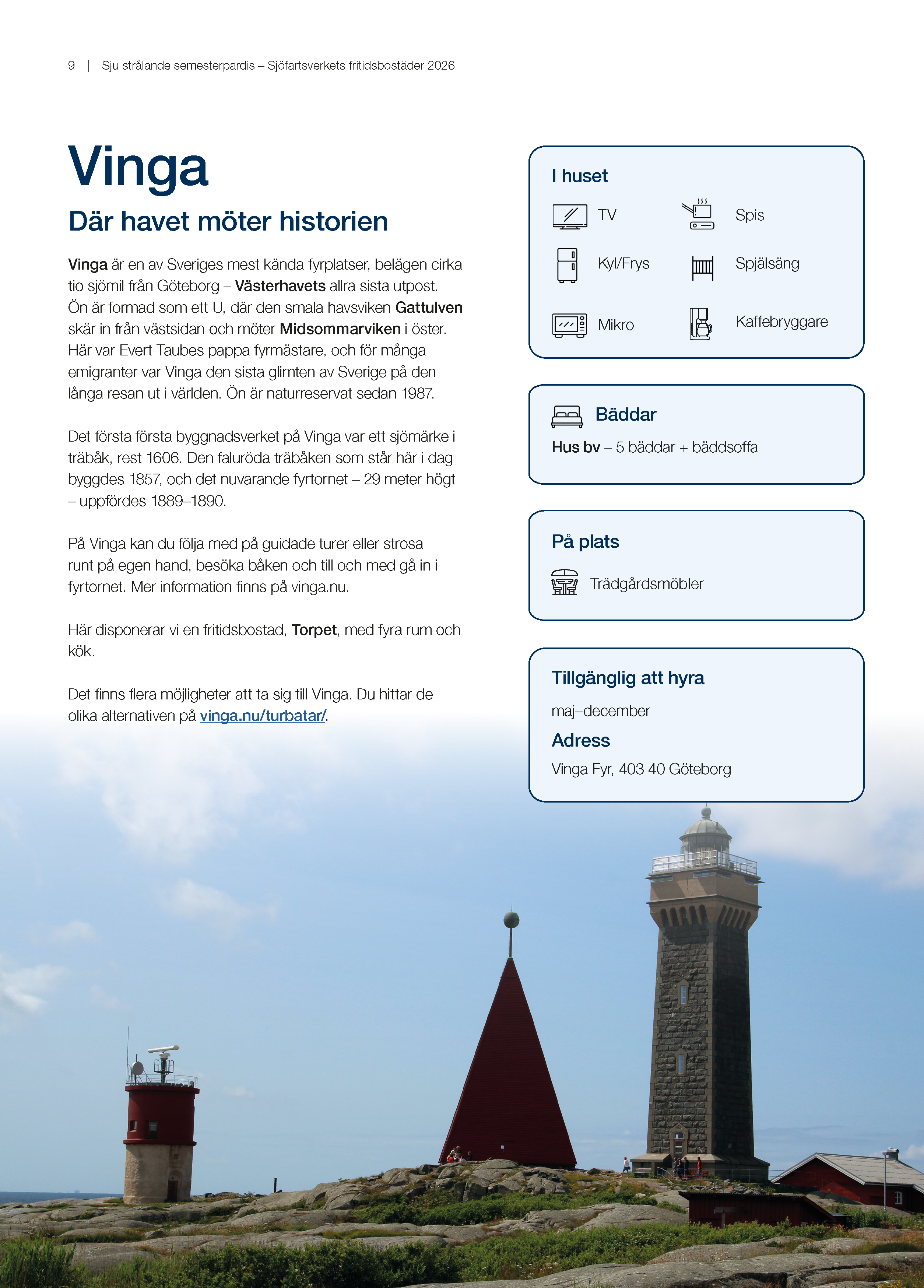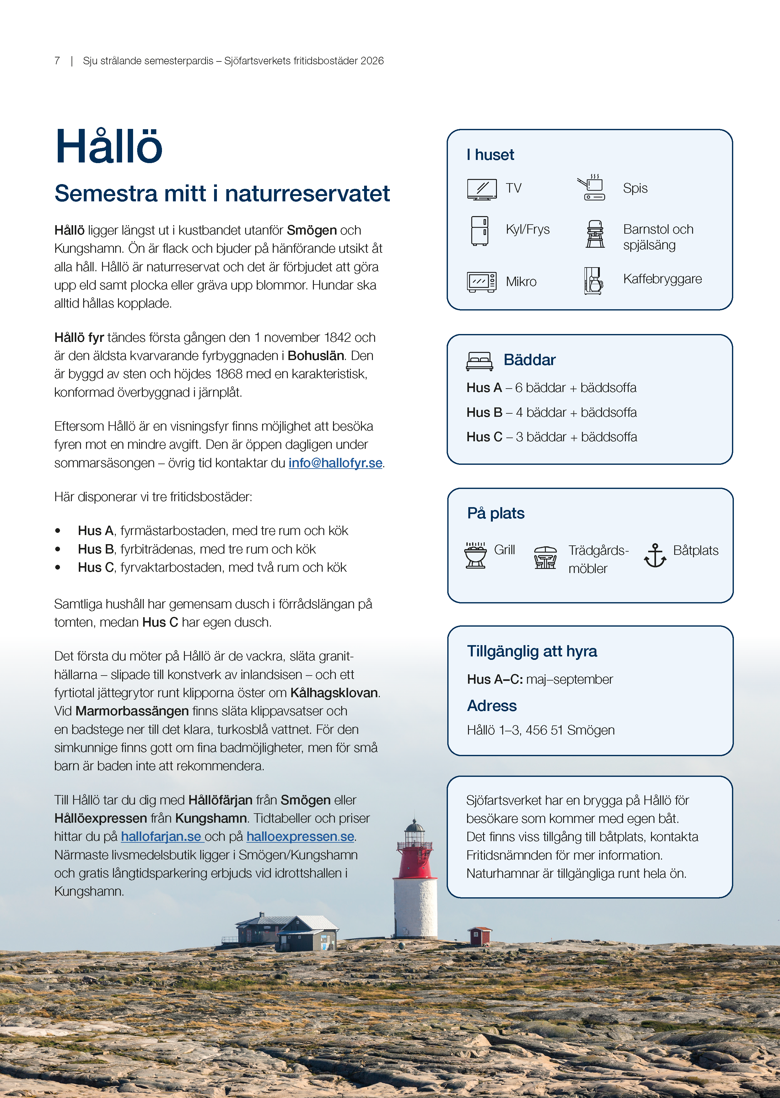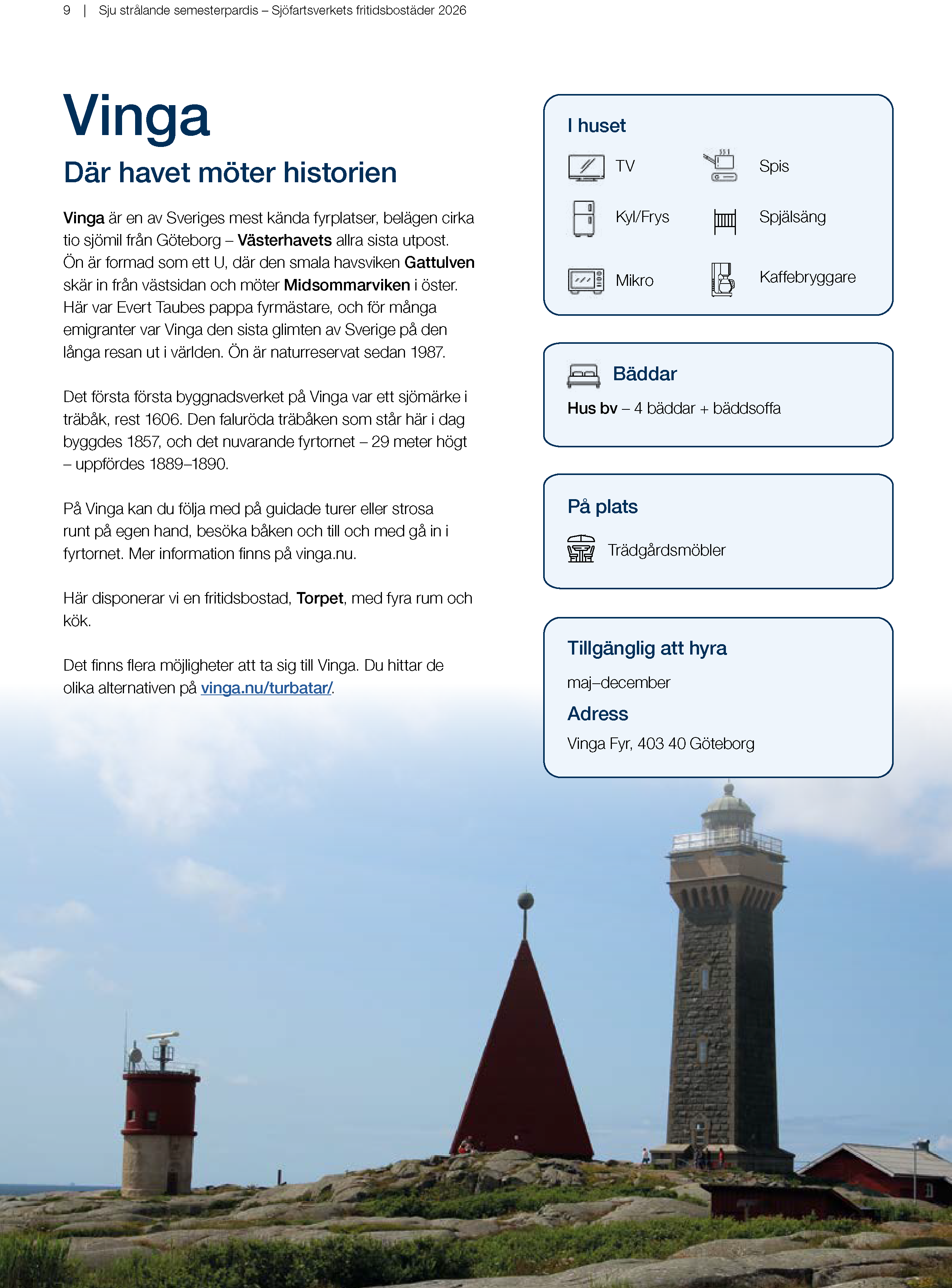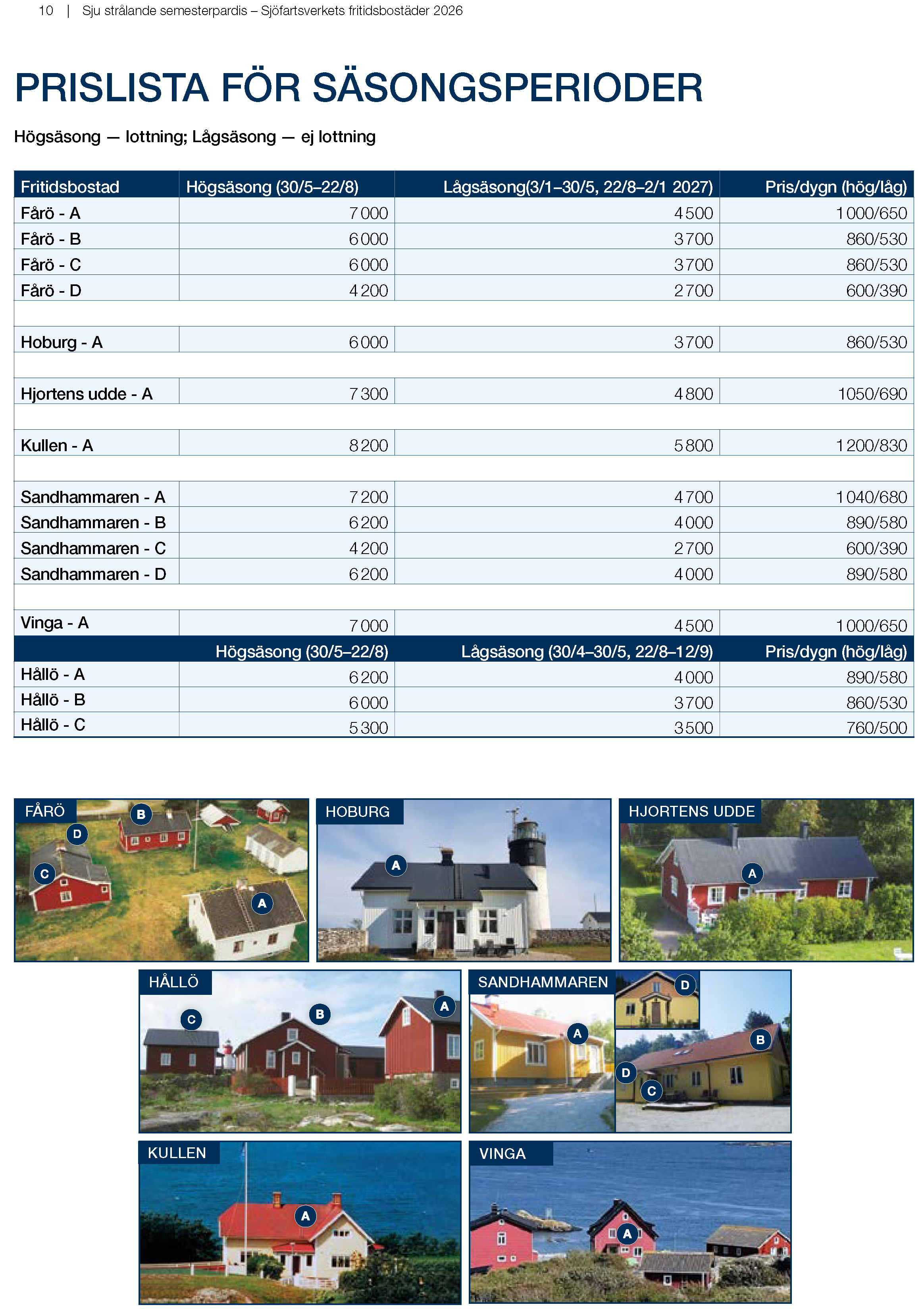 Sjöfartsverkets Fritidsnämnd presenterar under nedanstående länkar de aktuella platserna. Alla bostäder är modernt inredda och det enda man behöver ha med är sänglinne, handdukar samt toalett-, hushållspapper och rengöringsmedel.