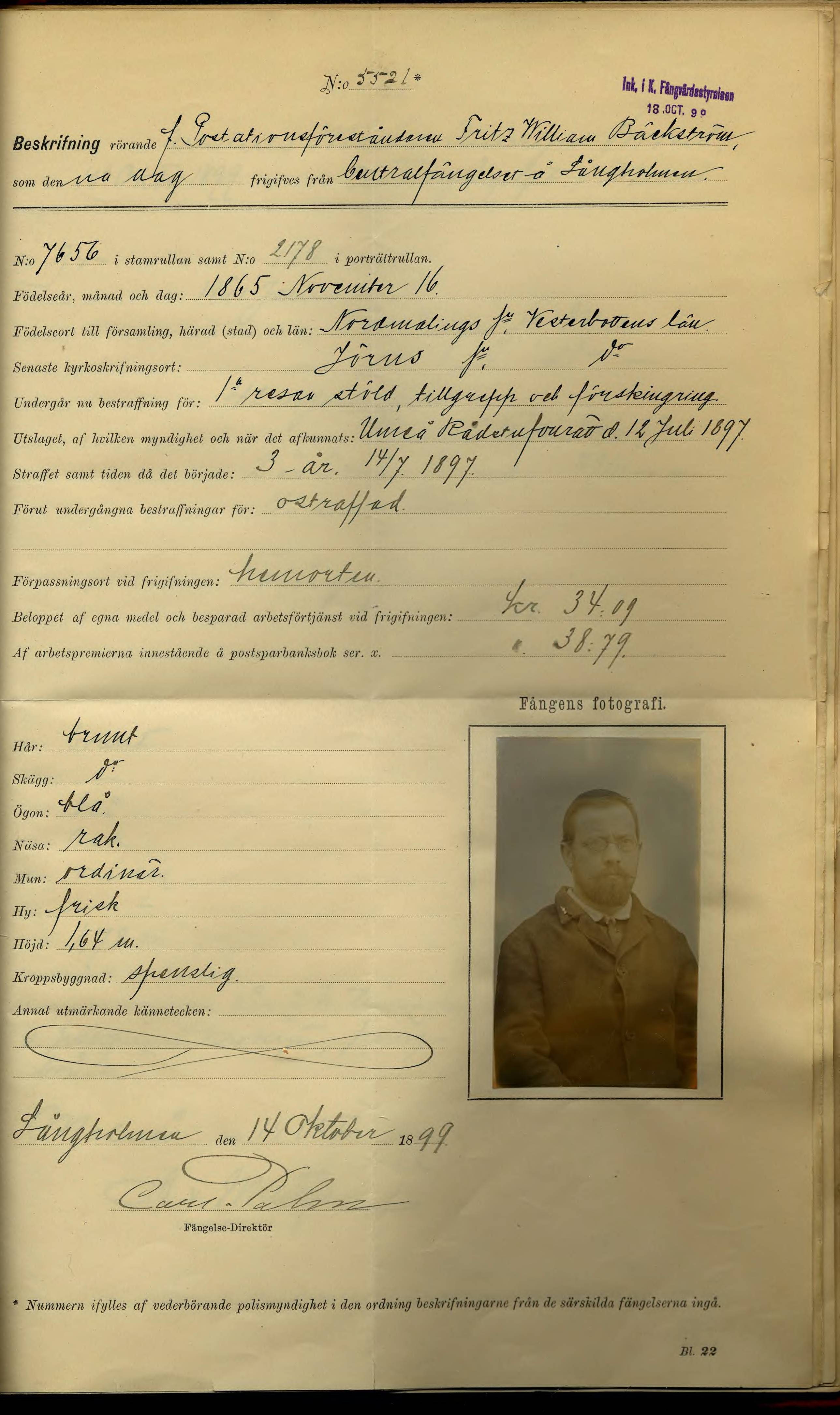 Carl Herman Engelbrekt Bäckström född 1843, yrke Besättningsman o fängelseföreståndare