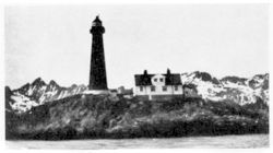 Moholmen fyrplats med sitt ursprungliga fyrtorn. Arkiv lokalhistoriewiki.no
